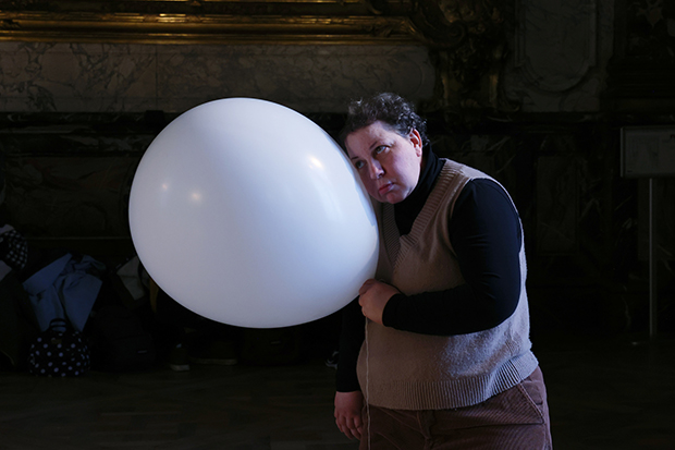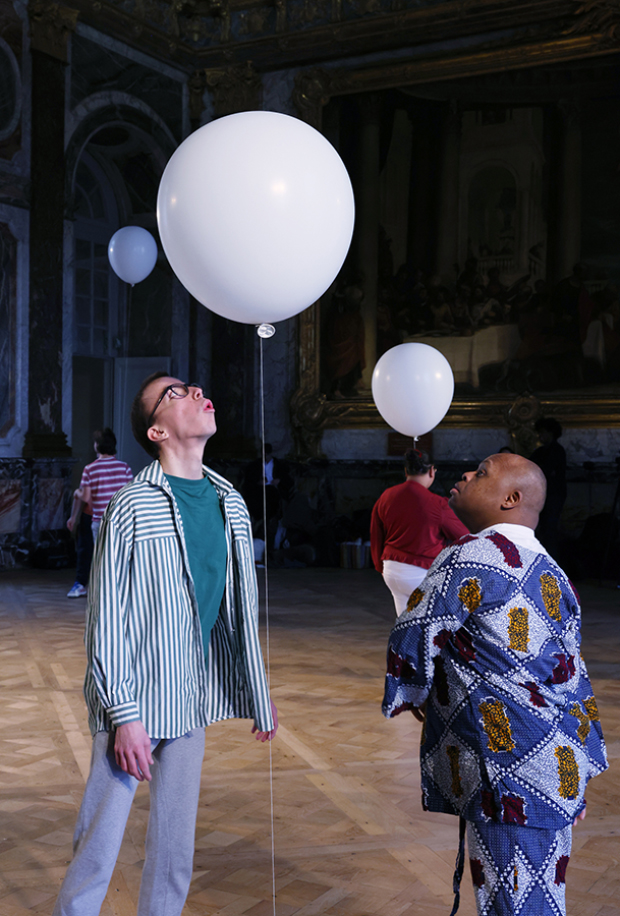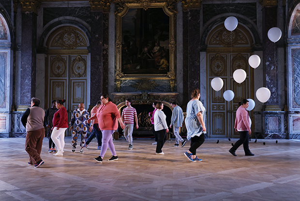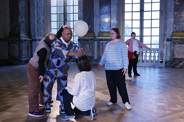 Quelques notes de violon, des ballons roses et les gestes poétiques de douze adultes en situation de handicap colorent le grandiose salon Hercule, le temps d’une semaine de rencontre, de partage et de création.