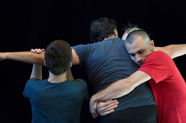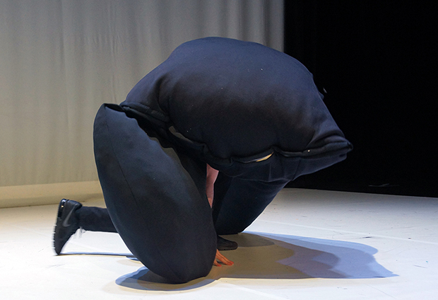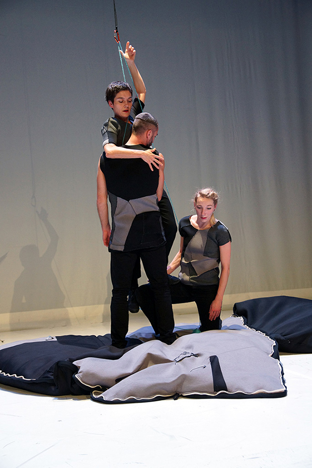 Cette masse molle, objet plastique créé par la plasticienne Céline Dufust, est un appui à la transformation. Au commencement, les corps des danseurs sont unis à cette masse, absorbés, morcelés. Ils cheminent ensemble, lentement, délicatement : comment s’ériger à trois, prendre appui, se laisser guider, prendre une direction commune pour ensuite chercher à se détacher, à se libérer, à prendre corps individuellement ? Cette pièce invite le spectateur à construire son regard.